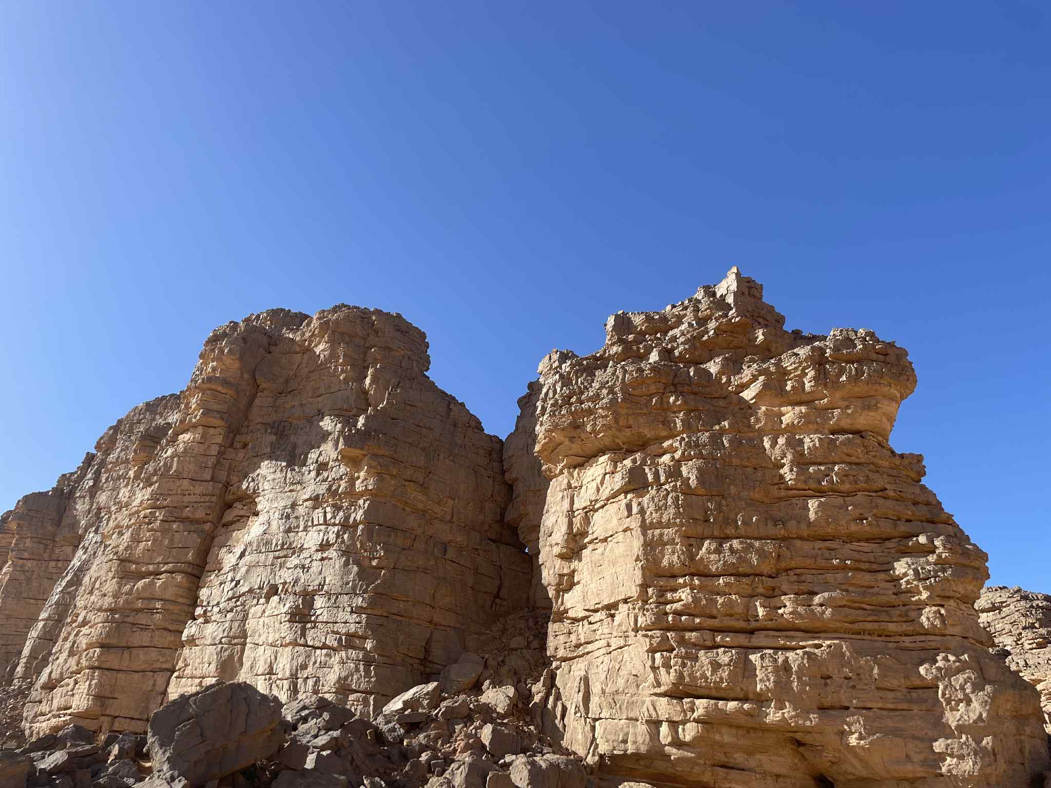 À midi, on s’abrite sous une roche ou un acacia solitaire, partageant un repas végétarien simple mais délicieux. Les formes étonnantes de Tikoubaouine, ses arches naturelles et ses canyons, offrent des points de vue spectaculaires — un véritable musée à ciel ouvert. La nuit tombe, le ciel s’ouvre, des millions d’étoiles s’allument une à une. Autour du feu, les voix des Touaregs s’élèvent, leurs chants résonnent dans le vent. La langue des touaregs est dominée par les voyelles a qui témoignent que le coeur des gens du désert est aussi immense que le pays.