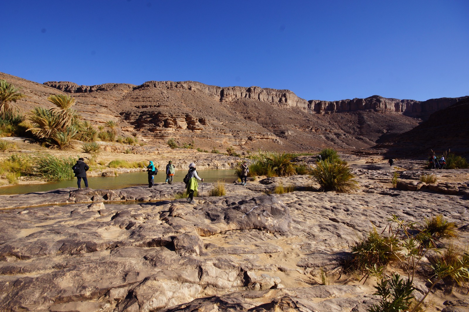 La journée débute autour d’un petit-déjeuner, savouré face à l’immensité du désert, avant de prendre la route vers le spectaculaire canyon d’Issendilène. Nous y ferons une halte pour le déjeuner, bercés par le murmure du vent et la beauté minérale des lieux, avant de partir en randonnée le long du canyon. Le sentier serpente au cœur d’une vallée de lauriers roses, où la fraîcheur contraste avec la chaleur du sable. Tout comme en Mongolie, on voit les animaux en liberté, ce qui prouve que les nomades touarègs restent fidèles à leur serment de respecter la liberté de leurs animaux d’élevage.